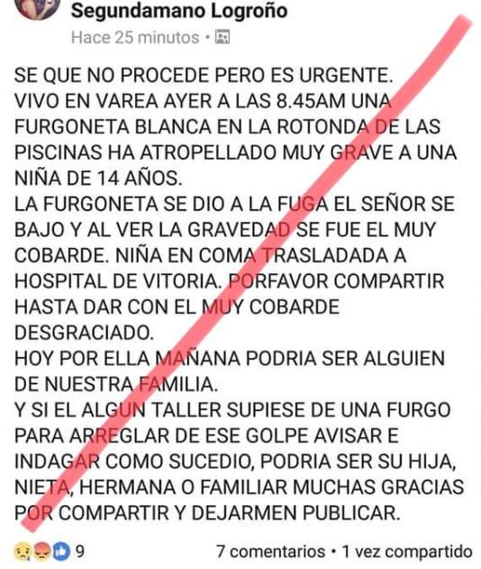 A raíz de este suceso, ha comenzado a circular a través de las redes sociales y los grupos de WhatsApp un mensaje que solicita la colaboración ciudadana para localizar al conductor de la furgoneta que, supuestamente, “se dio a la fuga al ver la gravedad del accidente”.