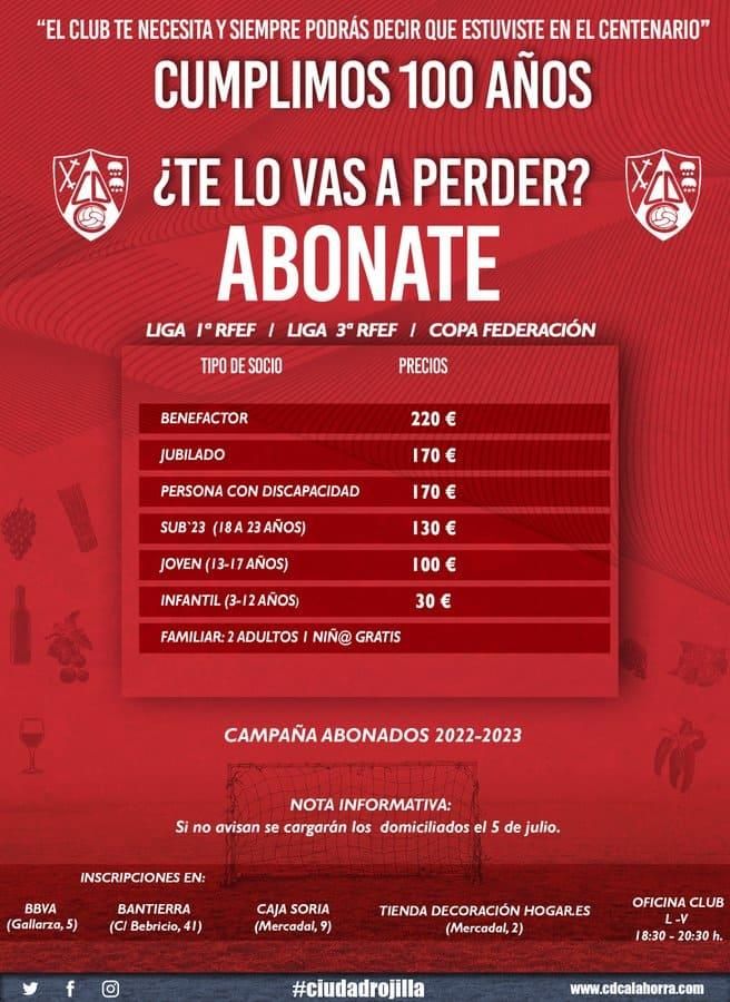 El Calahorra ha informado este martes en una nota de prensa de los precios de los abonos para la temporada 2022-23 acordados en la Asamblea General Extraordinaria de socios celebrada el lunes. La nota informativa reza de la siguiente manera: