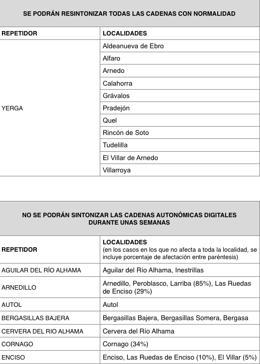 Concretamente, los repetidores afectados son los de Aguilar del Río Alhama, Arnedillo, Autol, Bergasillas Bajera, Cervera del Río Alhama, Cornago, Enciso, Herce, Igea, Munilla, Muro de Aguas, Préjano, Valdegutur y Valdeperillo. Los Ayuntamientos de estas localidades ya están al tanto de los trabajos que se están realizando y se les mantendrá informados puntualmente de cómo avanzan las actuaciones y del momento en el que la señal se recibirá de nuevo, para que los vecinos puedan adaptar las antenas colectivas y proceder a resintonizar los televisores.