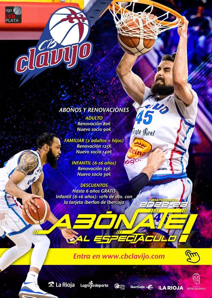 El Clavijo ha arrancado este lunes la campaña de abonados 2022-23. Con el inicio de LEB Plata a la vuelta de la esquina para los logroñeses: sábado 8 de octubre a las 20:00 en el Palacio de los Deportes contra CB Morón, los aficionados al equipo capitalino pueden adquirir desde ya sus abonos en https://cbclavijo.com/abonos/.