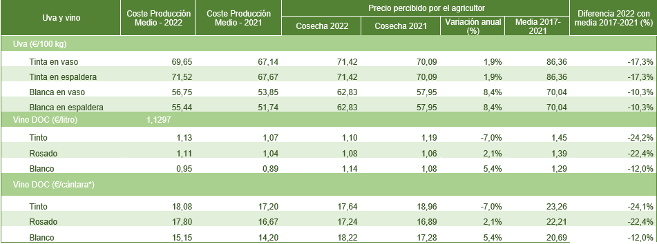 n comparación con la cosecha de 2021, y teniendo en cuenta un rendimiento medio de 6.218 kg/ha, en 2020 fue de 6,114 kg/ha, los costes unitarios de producción se han visto aumentados en uva tinta de vaso, de 69,65 euros por 100 kilos en 2022 respecto a 67,14 en 2021. En el caso de uva tinta en espaldera, el incremento es mayor, de 67,67 euros por 100 kilos en 2021, a 71,52 en 2022.