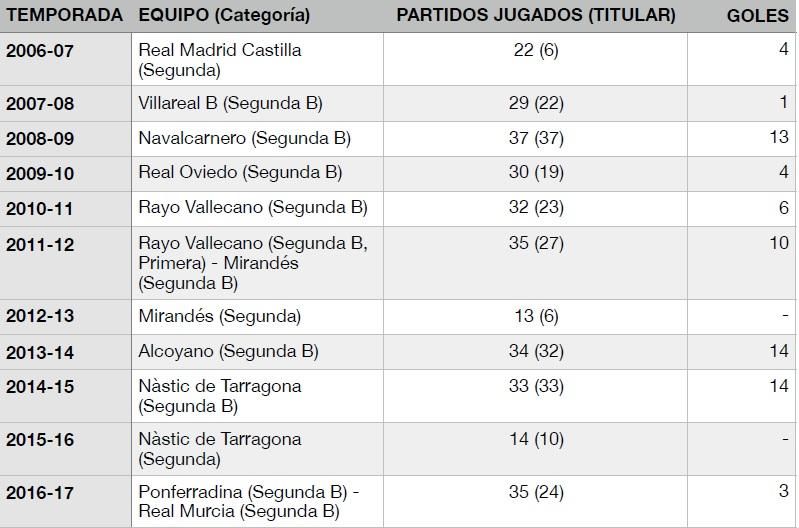 Se trata de un futbolista ampliamente experimentado en Segunda B, categoría en la que ha disputado un total de 259 partidos (216 de ellos