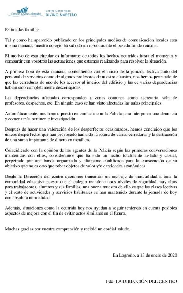 Tras el robo en el colegio Divino Maestro de Logroño, desvelado esta mañana de lunes por Rioja2, el centro ha enviado una circular a las familias tratando de tranquilizarles ante esta situación.