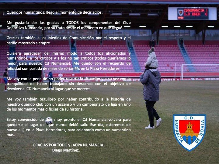El riojano Diego Martínez ha puesto punto y final a su trayectoria en el Numancia. El club anunció el pasado lunes la destitución del técnico y, este miércoles, Martínez ha compartido en Twitter una carta de despedida. El hombre que llevó al Calahorra al Playoff de Ascenso a Segunda División la campaña 2020-21 tras pasar por otros equipos riojanos como el Arnedo y el Náxara, firmó con el Numancia en el verano del 2021.