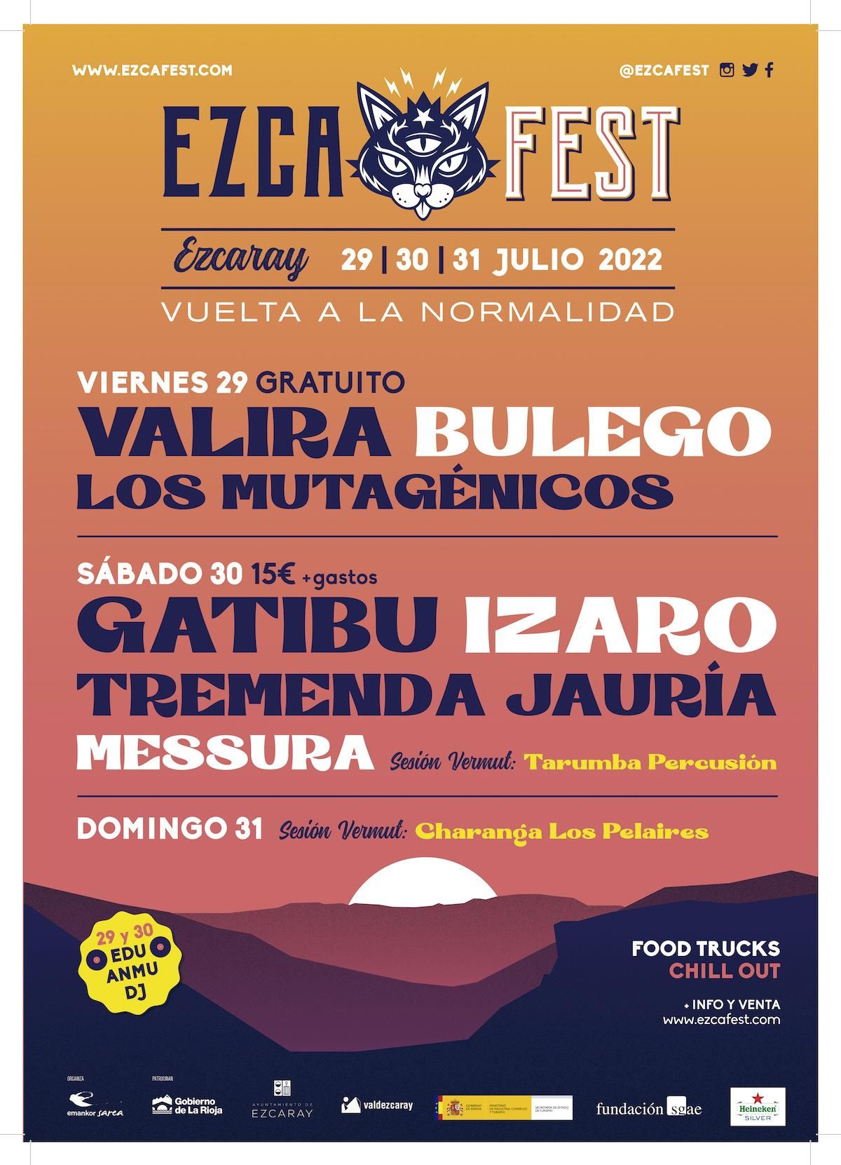 El EzcaFest 2022 se celebrará del 29 al 31 de julio y ha presentado hoy el cartel. El festival contará con las actuaciones de Valira, Bulego y Los Mutagénicos en la jornada gratuita del viernes y con Gatibu, Izaro, Tremenda Jauría y Messura, el sábado 30 de julio.