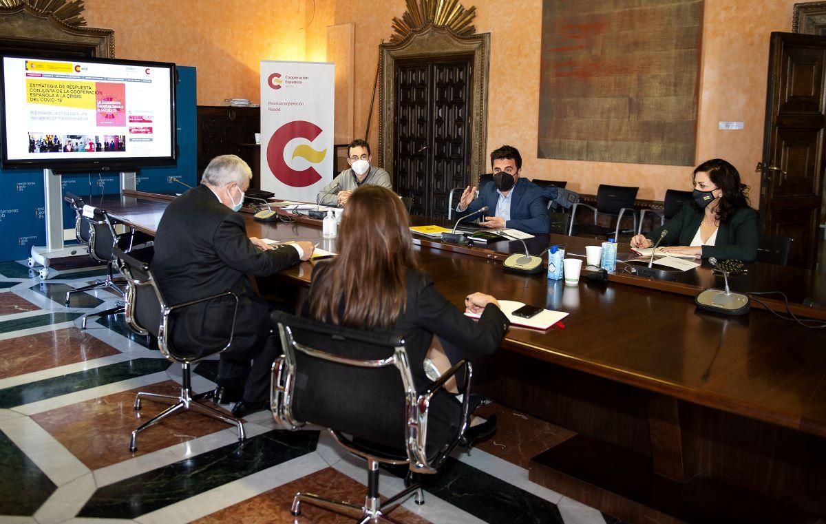 La presidenta del Gobierno de La Rioja, Concha Andreu, el consejero de Sostenibilidad y Transición Ecológica, Álex Dorado, y el director general de Calidad Ambiental y Recursos Hídricos, Rubén Esteban, se han reunido este miércoles con la secretaria de Estado de Cooperación Internacional, Ángeles Moreno, y el director de la Agencia Española de Cooperación Internacional para el Desarrollo (AECID), Magdy Martínez-Solimán, para presentar el proyecto de Geoparque de huellas de dinosaurio de La Rioja.