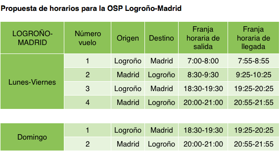 La propuesta, que se entregará al Ministerio de Fomento a través de la Dirección General de Aviación Civil, se ha centrado en la necesidad de establecer la OSP en la conexión con Madrid. Esta decisión se ha tomado tras analizar la oferta de servicios actuales y la demanda existente en los trayectos Logroño-Madrid y Logroño-Barcelona.
