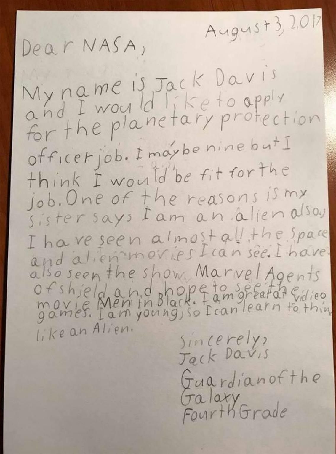 La oferta, publicada a mediados de julio, ha circulado últimamente por numerosos medios de comunicación y, en una de estas, debió caer en manos de Jack Davis, un niño estadounidense de nueve años, que estudia cuarto curso y se presenta como guardián las galaxias. Y, ni corto ni perozoso, cogió papel y lápiz. Este fue el resultado: