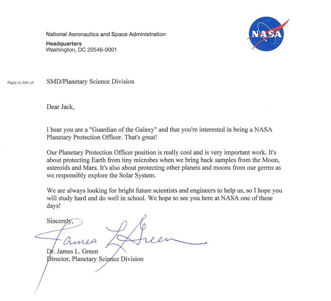 Esta historia no tiene desperdicio. Resulta que la NASA, según publica elpais.com, ha abierto un proceso de selección para contratar un director de protección planetaria y un guardián de la galaxia de 9 años y cuarto curso ha solicitado el puesto por vía postal. La agencia espacial estadounidense le ha respondido que estudie mucho y también que espera verle por allí un día de estos. Por partes.
