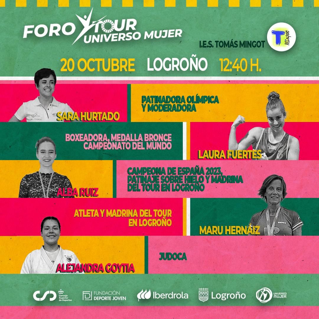Este viernes el IES Tomás Mingot acoge un foro moderado por la ex patinadora olímpica Sara Hurtado y que contará con cuatro grandes deportistas (Laura Fuertes, Alba Ruiz, Maru Hernáiz y Alejandra Goytia) dentro del Tour Universo Mujer, que pasa por Logroño este fin de semana. La nota informativa de Oé oé Marketing, con los detalles, dice así: