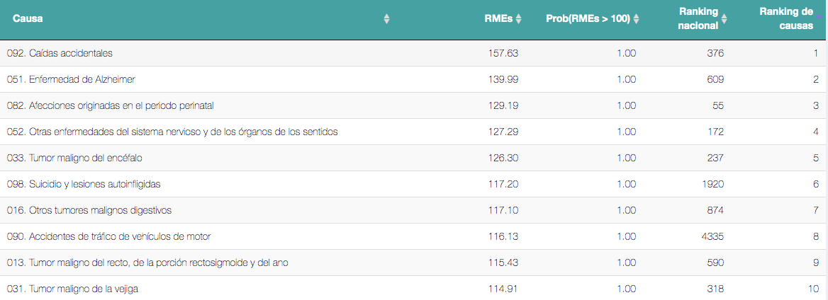 En Nájera y Torrecilla en Cameros, por el contrario, no hay causas de muerte de alto riesgo y en Santo Domingo de la Calzada, las prinicipales son accidentes de tráfico, cáncer de estómago y caídas accidentales. Por último, en Cervera hay alto riesgo de morir por insuficiencia cardiaca y osteoporosis.