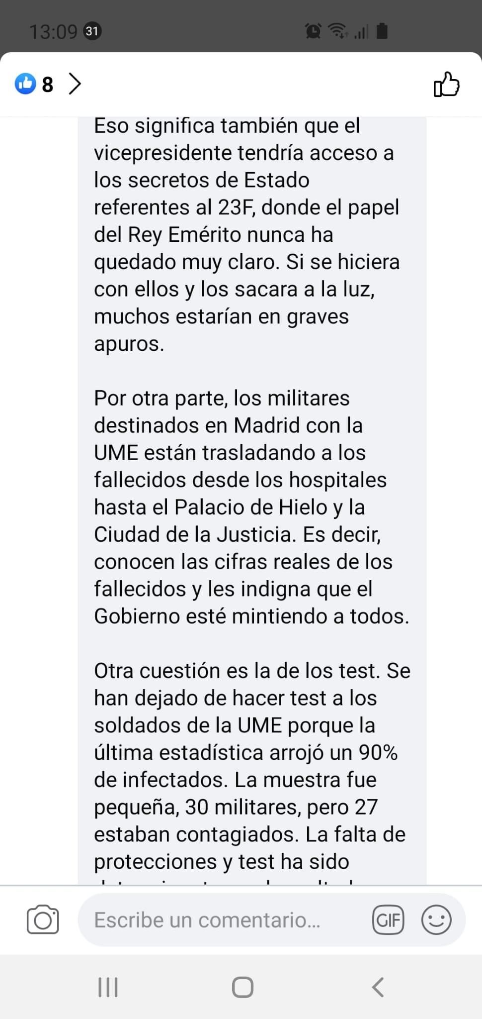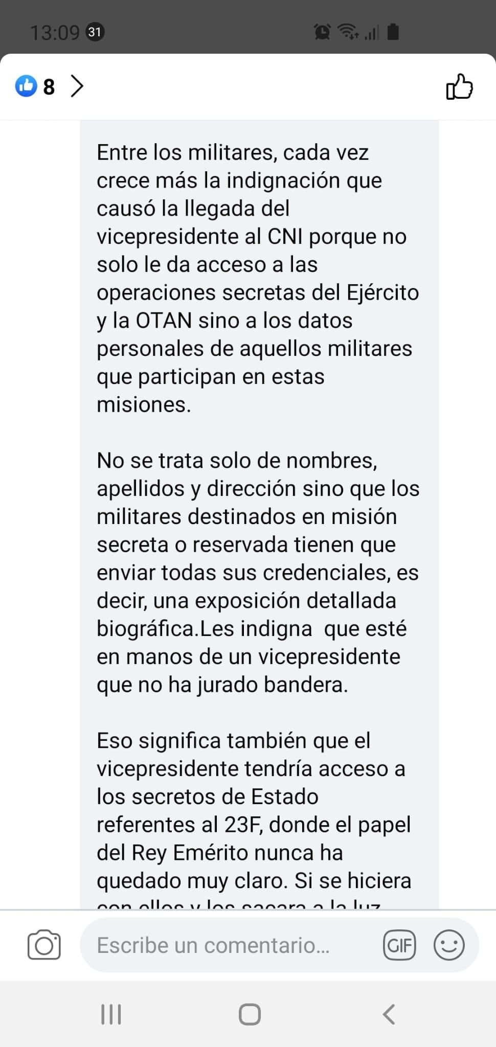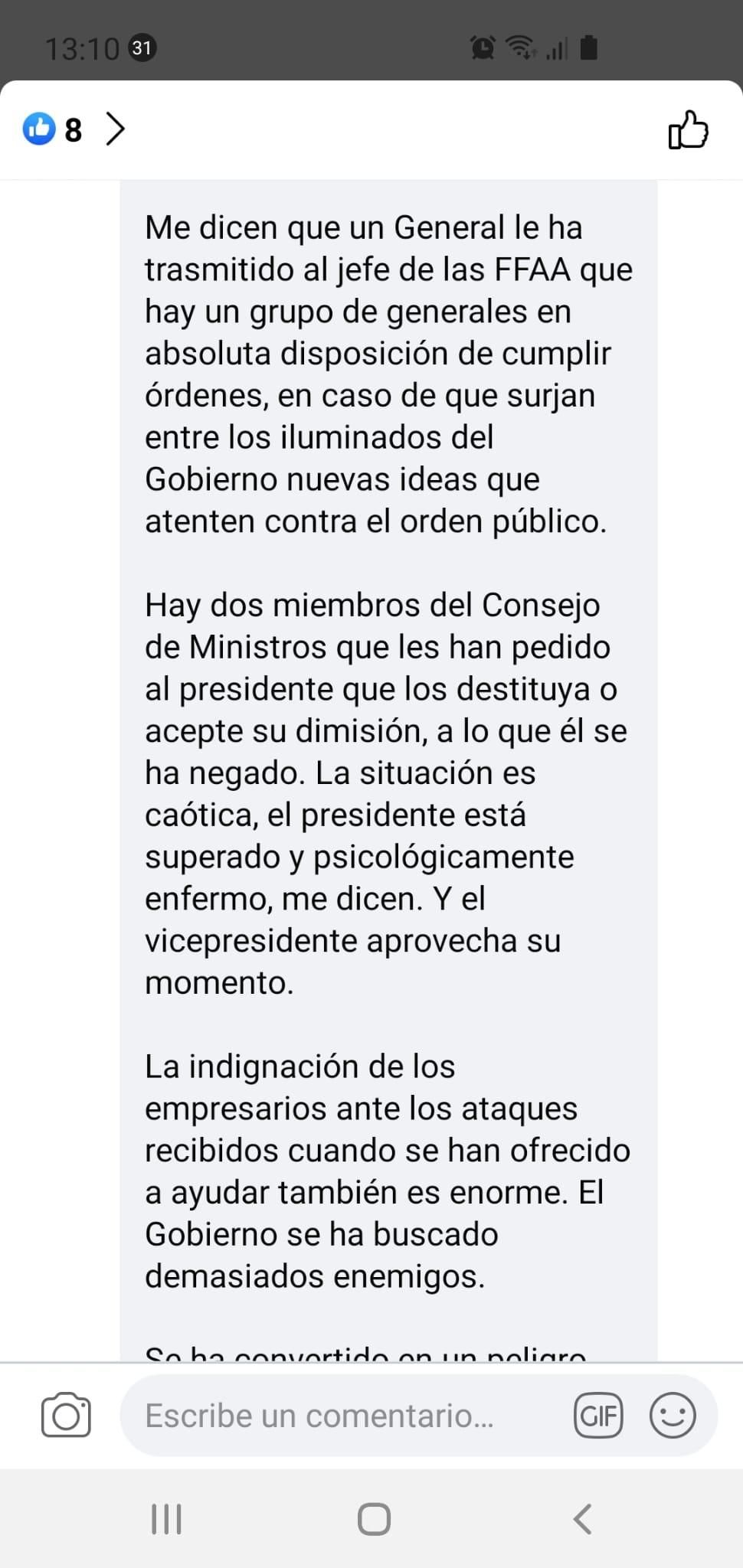 Concretamente compartía afirmaciones como las siguientes (literalmente): “Me dicen que un general le ha transmitido al jefe de las Fuerzas Armadas que hay un grupo de generales en absoluta disposición de cumplir órdenes en caso de que surjan entre los iluminados del Gobierno nuevas ideas que ataquen a orden público”.