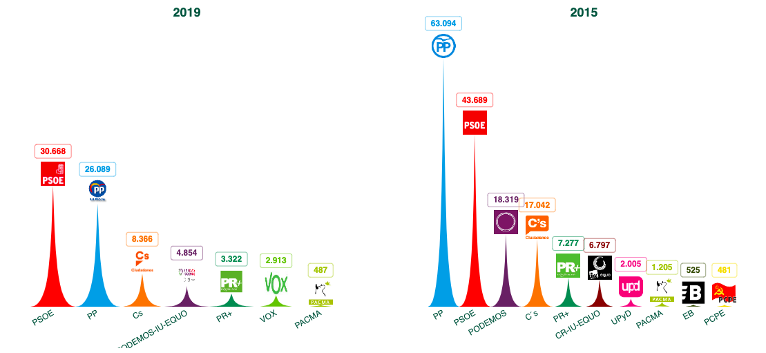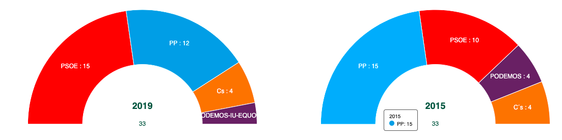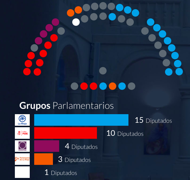 El PSOE ha conseguido la mayoría en el Parlamento de La Rioja (ha obtenido 5 escaños más). El Partido Popular pierde 3 diputados y se queda en 12. La formación naranja de Ciudadanos consigue mantener 4 escaños y Unidas Podemos reduce su participación a la mitad (pasando de 4 a 2 diputados).