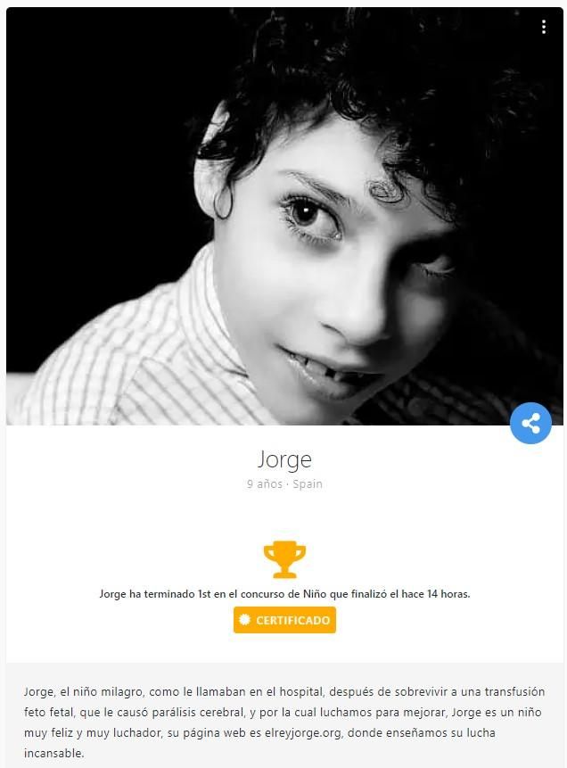 En su último llamamiento a la sociedad pedían ayuda para lograr ganar el concurso de Niño de Bidiboo. La noche del 20 de febrero anunciaban en su página web que Jorge había quedado primero de toda España. La madre de Jorge agradecía a todos los que han votado a su hijo y aprovechaba para anunciar que el dinero del premio lo iba a utilizar para continuar con sus terapias.