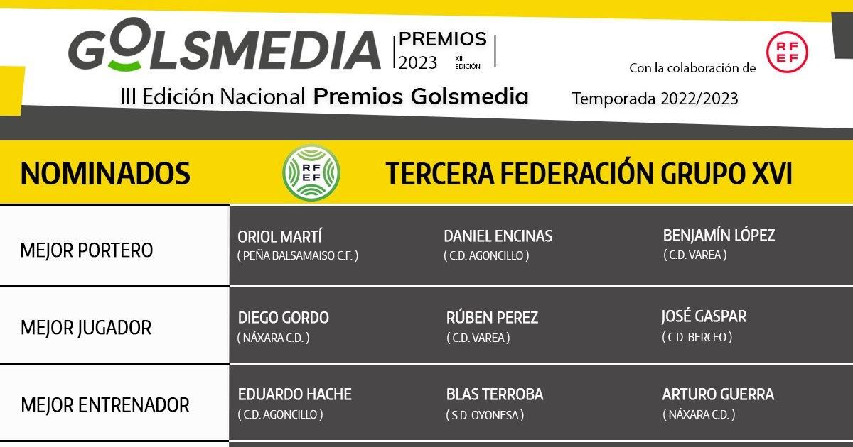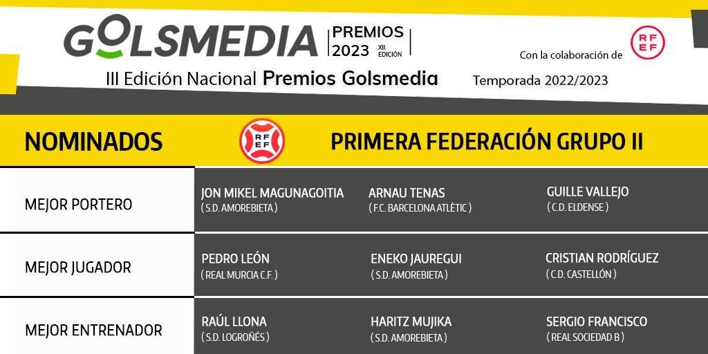 Este invierno se celebrará la III Edición Nacional de los Premios Golsmedia, que cuenta con la colaboración de la Real Federación Española de Fútbol. Golsmedia.com ya ha anunciado los nominados que van a coronar a los mejores jugadores y entrenadores de todos los grupos de 1ª Federación, 2ª Federación y Tercera División de fútbol masculino y femenino de la campaña 2022-23; y a los mejores jugadores y entrenadores de los 7 grupos de División de Honor Juvenil 22-23.