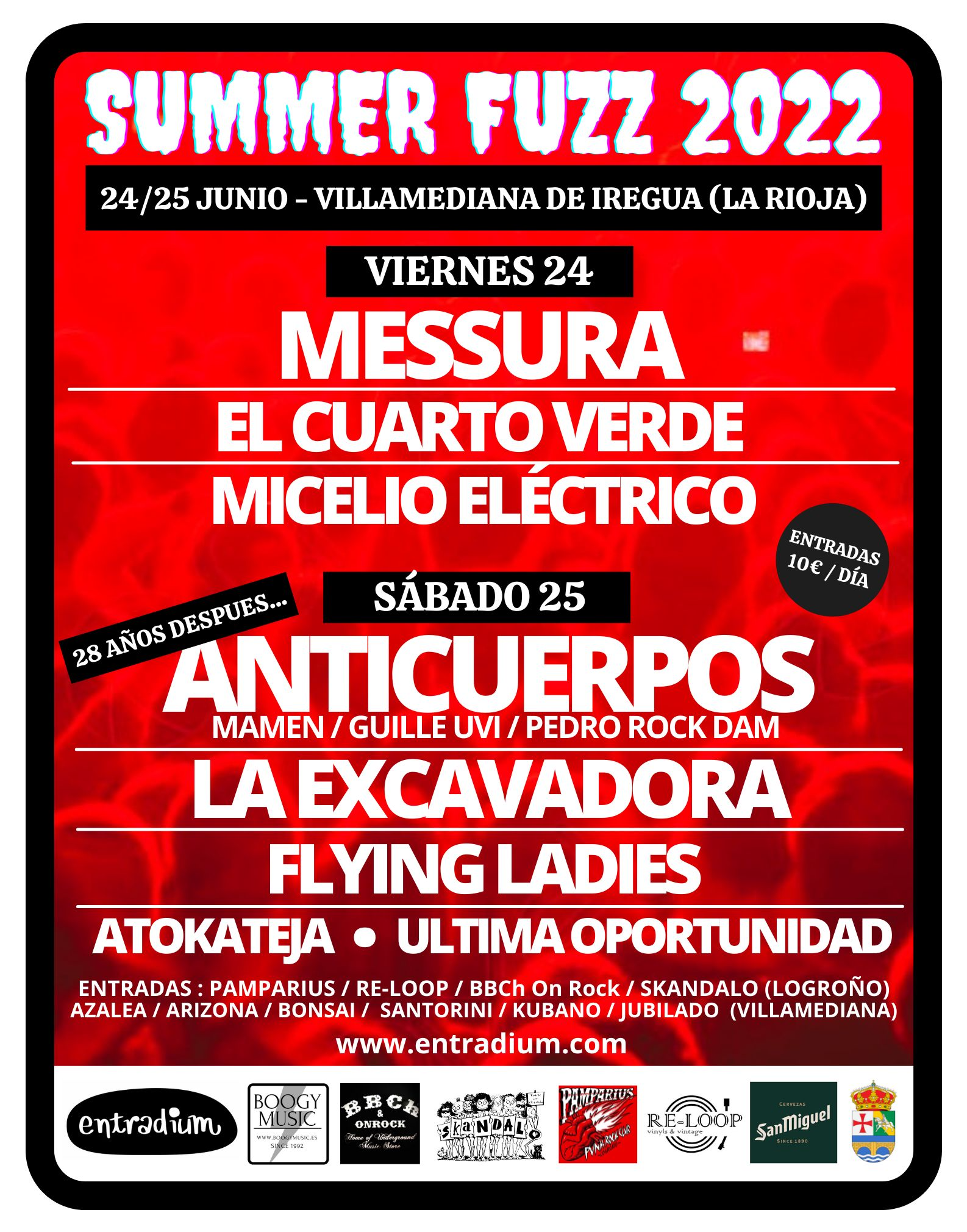 El cartel del festival Summer Fuzz 2022 comienza el viernes, 24 de junio, con los conciertos de Messura, El Cuarto Verde -que presentan su quinto disco-, y Micelio Eléctrico y su música que ahonda en el rock y el blues. Al día siguiente, sábado 25 de junio, será el turno de Anticuerpos, La Excavadora -con uno de los mejores discos del pasado año-, Flying Ladies -máximos representantes del punk de provincias-, Atokateja -punk-rock desde la localidad vecina de Albelda- y Última Oportunidad, banda local de Villamediana que mostrará en directo su nuevo disco.