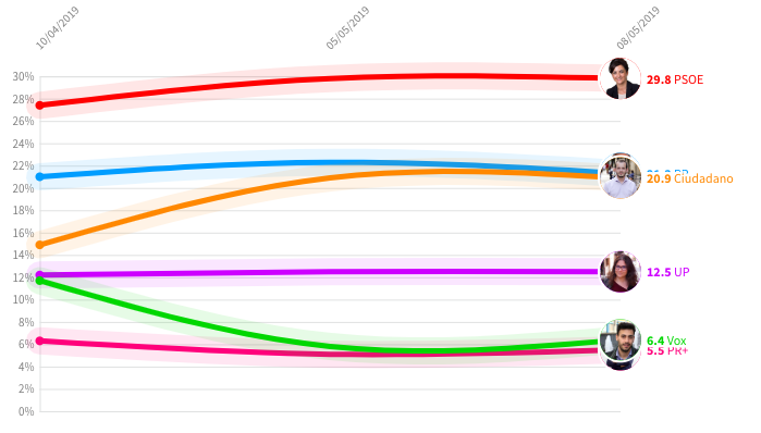 El PSOE se mantendría a la cabeza, de cara a las elecciones autonómicas del 26 de mayo con un 29,8% de los votos. Le siguen PP y Cs, que siguen acortando distancias, obteniendo casi el mismo resultado en La Rioja. Así, el PP seguiría bajando en sus resultados respecto al sondeo realizado hace tres días, pasando de un 22,3% el pasado 5 de mayo al 21,3% a día de hoy. Ciudadanos sigue acortando distancias ya que se mantiene en el 20,9% de los votos.