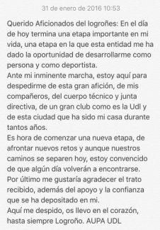 Indica que “es hora de comenzar una nueva etapa, de afrontar nuevos restos y aunque nuestros caminos se separesn, estoy convencido de que algún día volverán a encontarse”. Asimismo, concluye diciendo que agradece “el trato recibido, además del apoyo y la confianza que se ha depositado en mí. Os llevo en el corazón, hasta siempre Logroño. Aúpa UDL”.