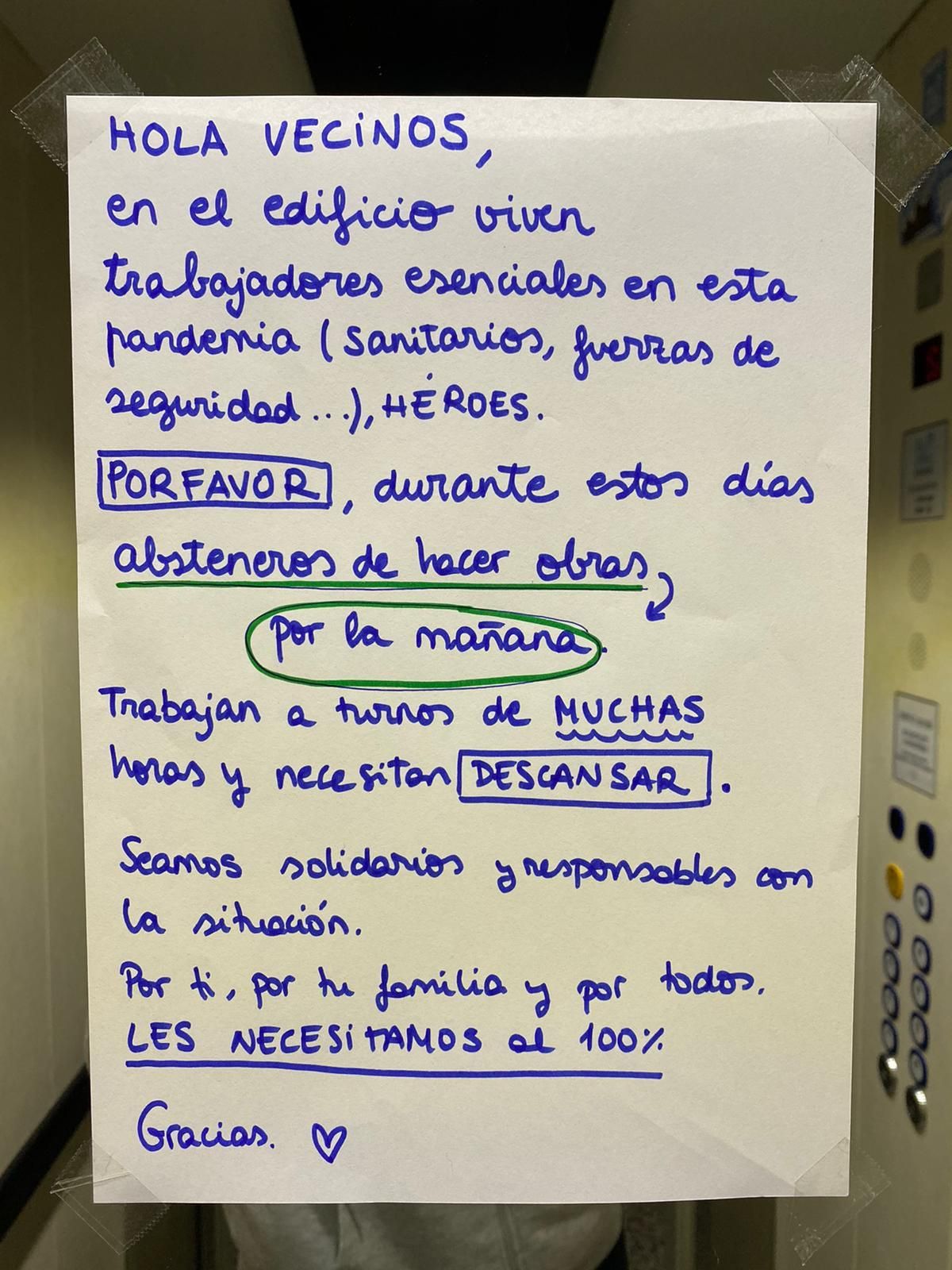 En el edificio viven trabajadores esenciales, como sanitarios, fuerzas de seguridad... “héroes”, definen en el cartel. Para que estas personas, que trabajan por turnos, puedan descansar piden ser solidarios y responsables con la situación. “Por ti, por tu familia, por todos, los necesitamos al cien por cien”, señalan.