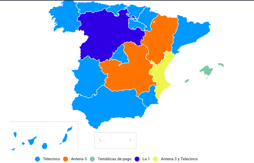 Por comunidades autónomas, Andalucía, Cataluña, País Vasco, Galicia, Madrid, Canarias, Asturias, Murcia, Cantabria, La Rioja y Navarra se decantan por Telecinco, mientras que Aragón y Castilla-La Mancha prefieren Antena 3. Solo en Castilla y León destaca La 1. Por su parte, Antena 3 y Telecinco empatan en la Comunidad Valenciana y las temáticas de pago dan la sorpresa en las Islas Baleares.