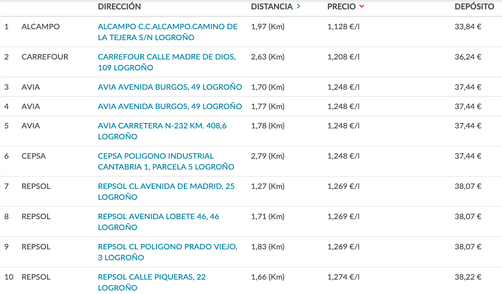 En Logroño, la más barata en este momento es la gasolinera de Alcampo Parque Rioja. De hecho, la diferencia entre esta y la que ocupa el número diez en la lista es de casi 5 euros por depósito.