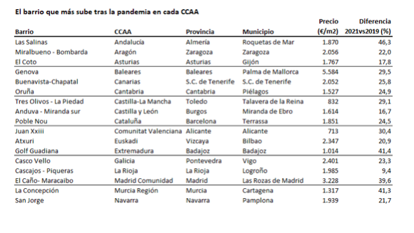 En La Rioja, el barrio que más ha subido tras la pandemia es Cascajos-Piqueras, en Logroño, donde ha subido el precio un 9,4% en este periodo. Además, el barrio más caro de La Rioja es San Adrián-La Cava, con un precio de 2.064 euros el metro cuadrado.