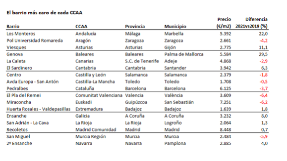 Si Andalucía concentra los barrios que más suben, los más caros están preferentemente situados en la ciudad de Madrid. El barrio capitalino de Recoletos es el que tiene el precio medio más elevado del país, alcanzando los 8.448 euros/m2. El siguiente es también un clásico entre los vecindarios más exclusivos del país: el barrio donostiarra de Miraconcha y sus 7.251 euros/m2. El tercer puesto es para los Jerónimos en Madrid (6.917 euros/m2), seguido por el Área Romántica de San Sebastián (6.869 euros/m2).