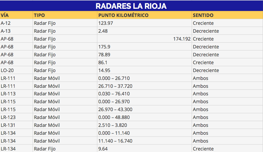 Los radares fijos en La Rioja están en la N-232, la A-12, A-13, AP-68 y en la circunvalación, mientras que los móviles se situarán en la N-232 la mayoría de ellos, N-111, LR-254, LR-209, LR-250, LR-111, LR-113, LR-115, LR-123, LR-131 y LR-134.