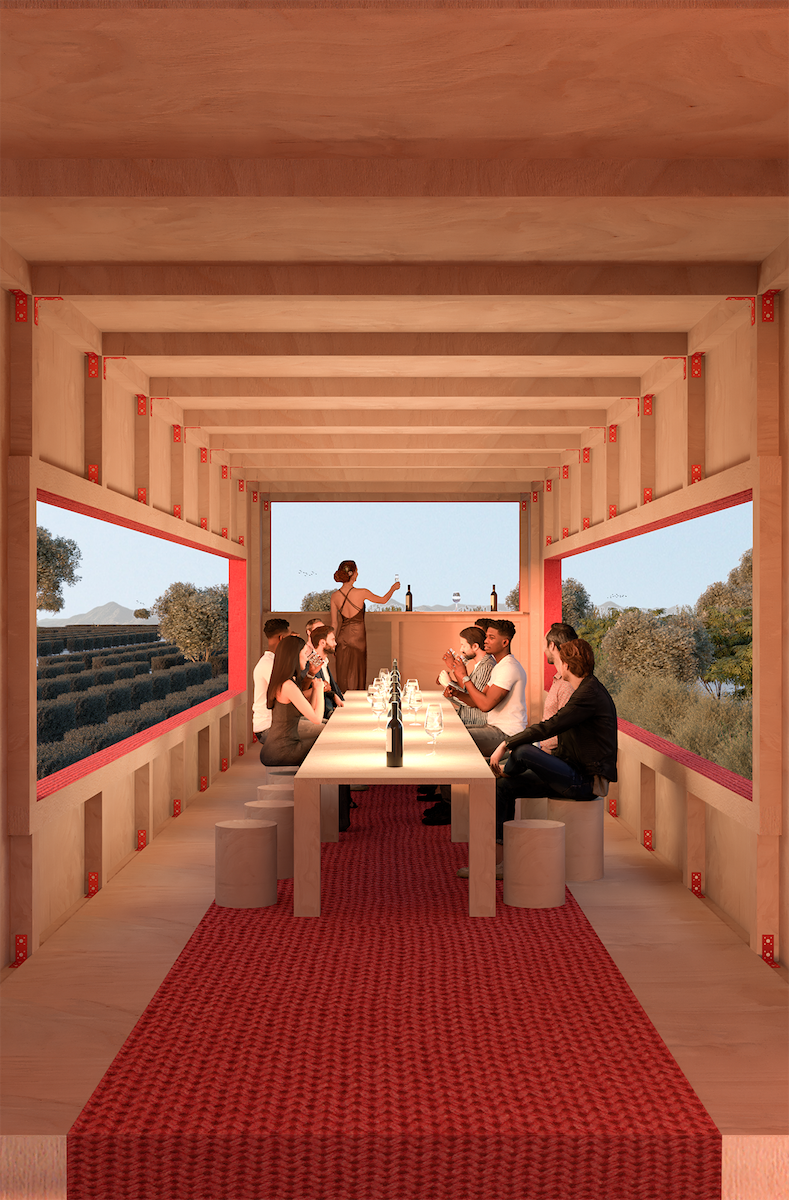 En Viña Lanciano se desarrollará una Mesa Elevada en el Paisaje, realizada por Jennyfher Alvarado Figueroa, Alvaro Gonzalez Serrano / España. Una alfombra roja que transiciona desde el paisaje a un espacio doméstico encontrado, tras el telón aparecerá una mesa elevada, donde los visitantes se podrán reunir para compartir una experiencia a través de los sentidos y crear lazos con el contexto. Huecos en la fachada reflejarán el movimiento del interior, pero sin competir con la importancia del paisaje, estas vistas se enmarcan con un sutil listón rojo, que vincula el contexto siempre presente con la actividad interior.