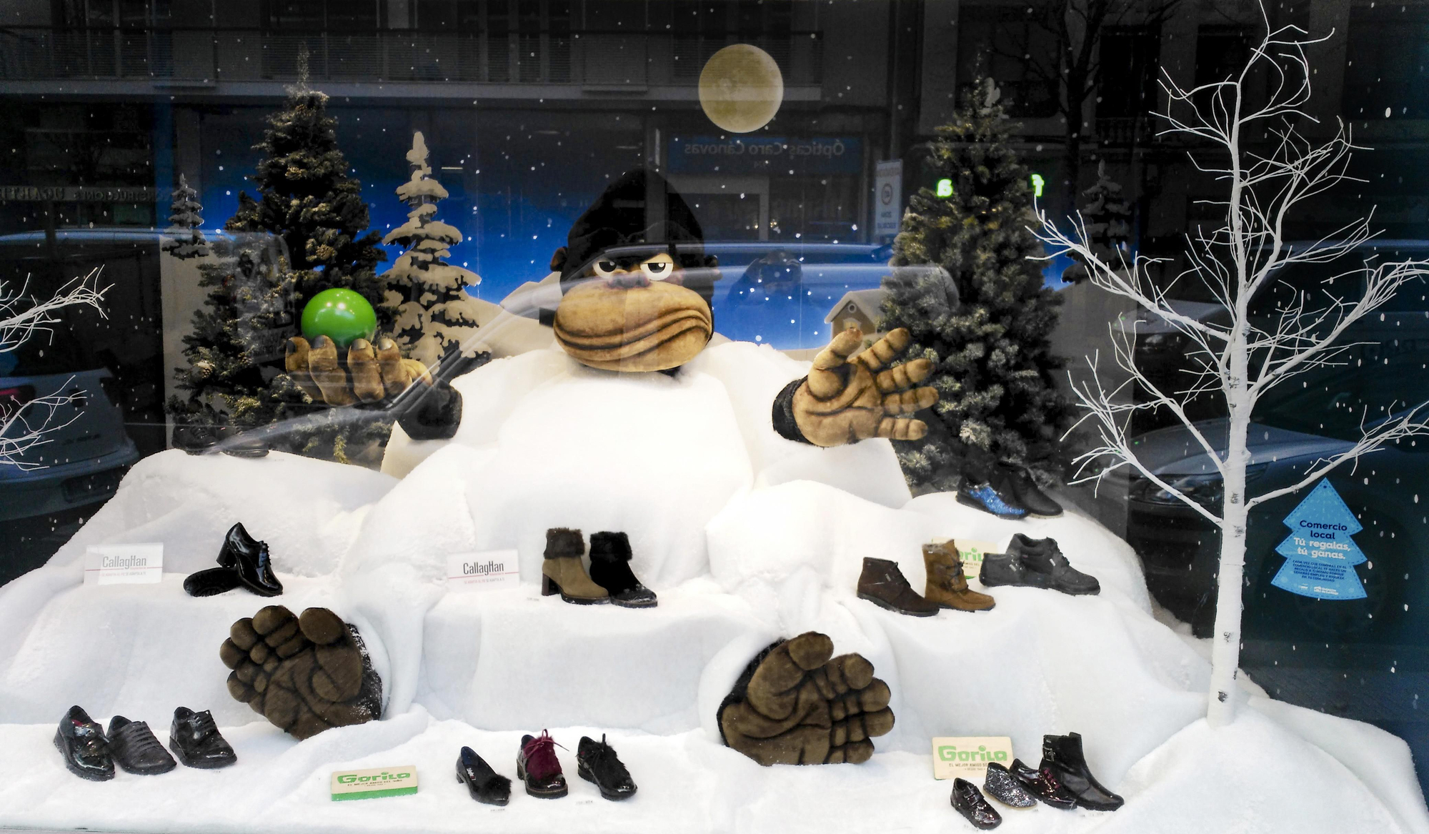 Calzados Callaghan, en Vara de Rey, 34 de Logroño, ha sido galardonado con el segundo premio con una propuesta que resalta uno de los iconos de la marca, como es Gorila, un muñeco articulado que saluda a los viandantes mientras emerge de la nieve. Mientras, muestra su producto de manera sutil y en perfecta armonía con el escaparate.