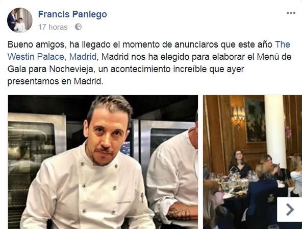 “Bueno amigos, ha llegado el momento de anunciaros que este año el The Westin Palace, Madrid nos ha elegido para elaborar el Menú de Gala para la Nochevieja, un acontecimiento increíble que ayer persentamos en Madrid”.