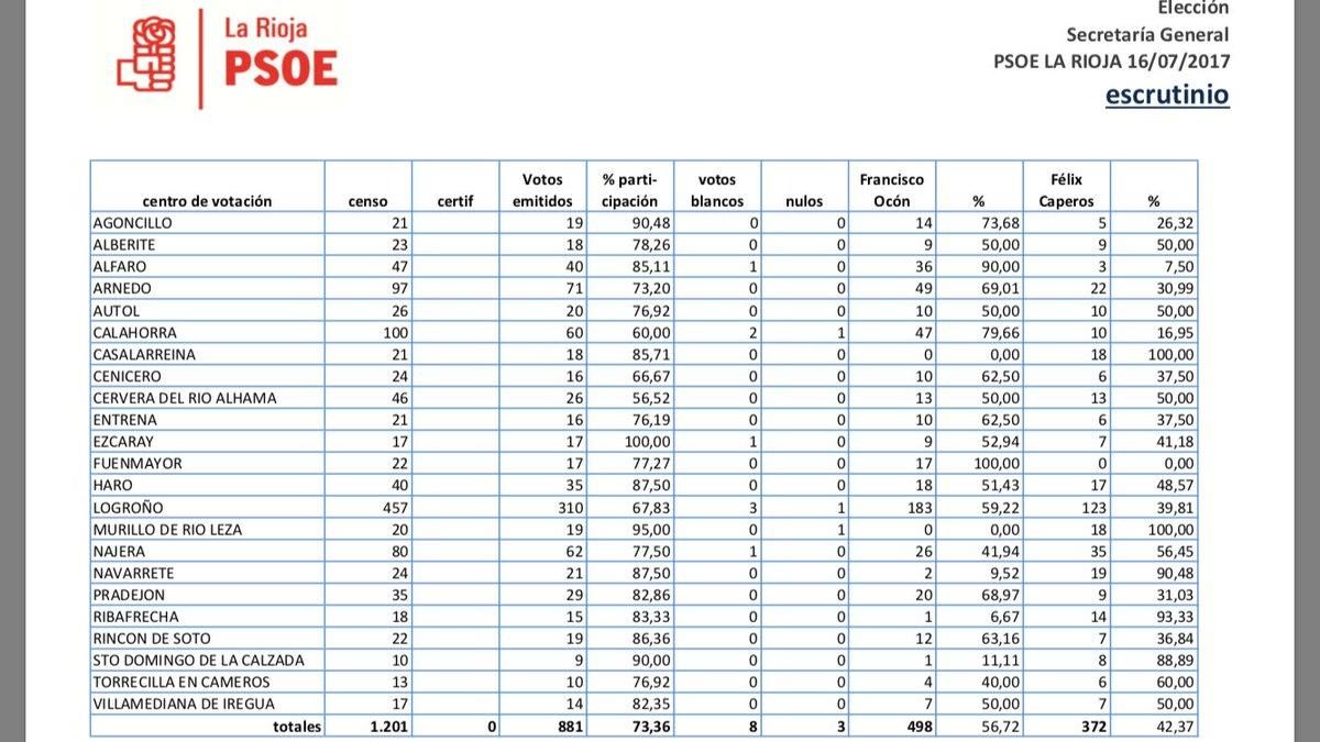 La propuesta de Félix Caperos, el otro candidato, alcalde de Casalarreina y también diputado regional, ha sido apoyada por 372 votos, lo que representa el 42,37% de los votos. La participación se ha situado en el 73,36%. Han acudido por tanto a votar un total de 881 personas de los 1.201 militantes del PSOE de La Rioja y Juventudes Socialistas que estaban llamados a las urnas.