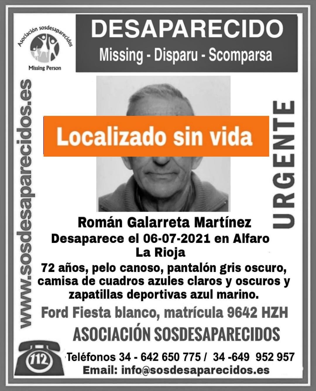 Este miércoles ha sido encontrado en el canal de Lodosa el cuerpo sin vida del vecino de Corella Román Galarreta, de 72 años, desaparecido desde el martes por la mañana.