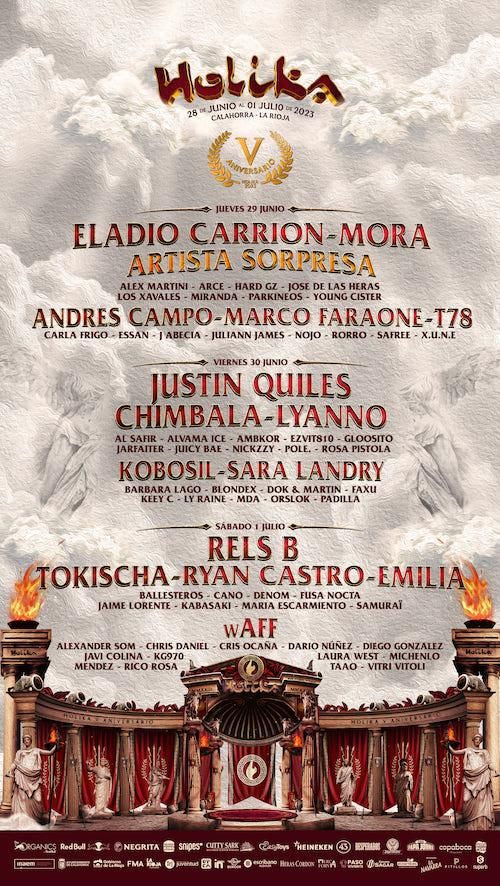 El cartel de estrellas que aterrizarán este año en Holika se ha convertido en un reclamo incontestable para agotar los abonos tan rápidamente. El festival concentrará durante tres jornadas a los mayores exponentes mundiales del género urbano y la electrónica. El jueves 29 de junio estará encabezado por Eladio Carrión, Mora, Andrés Campo, Marco Faraone y T78, que estarán acompañados sobre los dos escenarios principales de la cita por un artista sorpresa que se desvelará en el último momento.