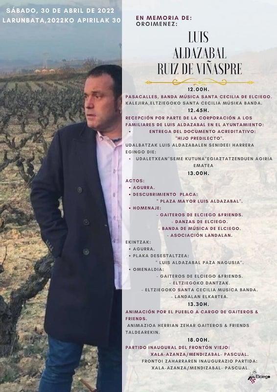 El sábado 30 será un día especial en Elciego. Y es que será un día de recuerdo, de homenaje y de reconocimiento a Luis Aldazabal Ruiz de Viñaspre, fallecido de forma repentina el pasado mes de enero.