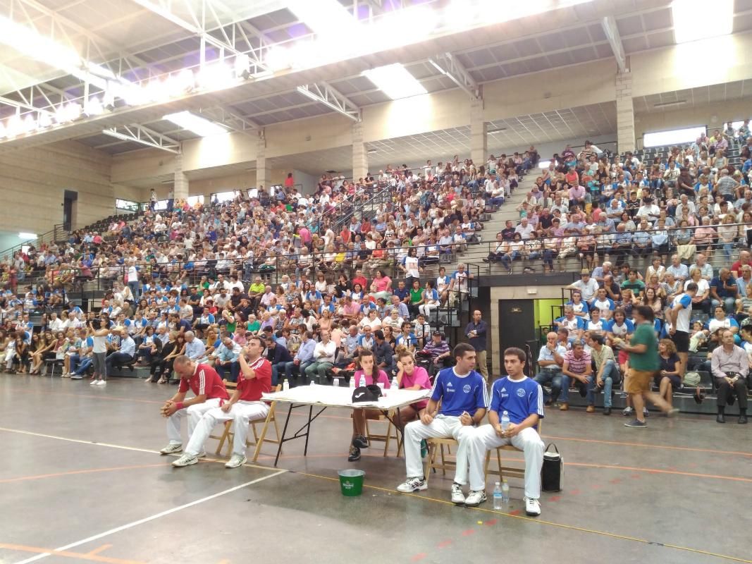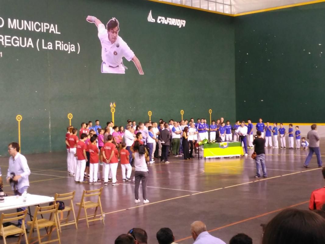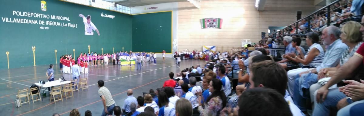 Tras los aficionados llegó el acto que había llenado el hasta ahora llamado Polideportivo Municipal de Villamediana de Iregua, el homenaje a Bastida. Lo resumiremos diciendo que fue emotivo sin llegar a lo lacrimógeno, extenso sin llegar a aburrir, y entrañable, muy entrañable. Al final, entre pelotaris locales y foráneos, autoridades, más amigos de Villamediana y del resto de La Rioja, casi había tanta gente en la cancha junto al homenajeado, como en la grada.