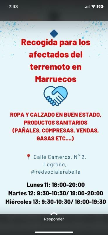 Desde la Asociación de mujeres Árabes en La Rioja, Arabella, han organizado una recogida para las personas afectadas por el terremoto en Marruecos. Como han compartido, a través de redes sociales, se podrá entregar ropa y calzado en buen estado así como productos sanitarios en su sede, ubicada en el número 2 de la calle Cameros.