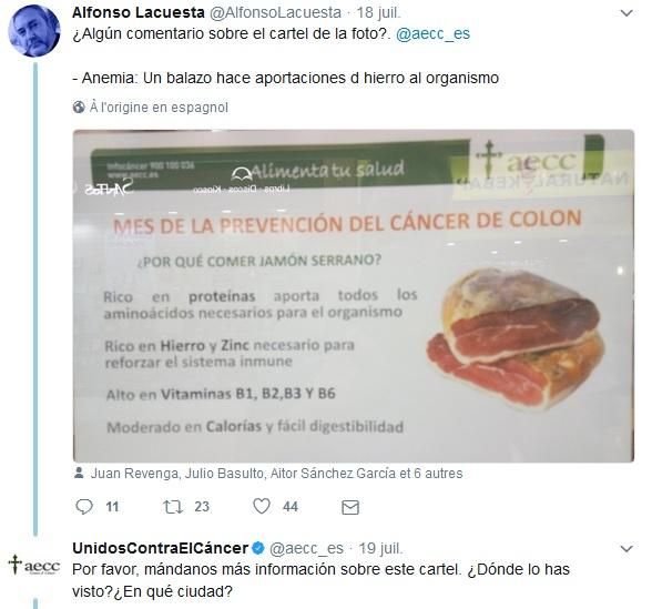 La polémica surgió en Twitter cuando algunos usuarios preguntaron a la AECC por el mismo ya que daba a entender que el jamón sirve para prevenir esta enfermedad.