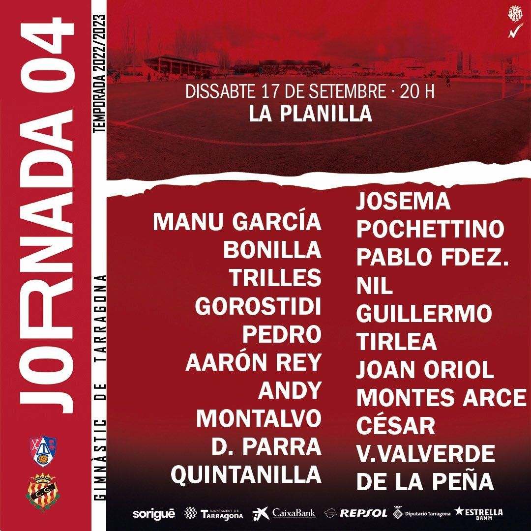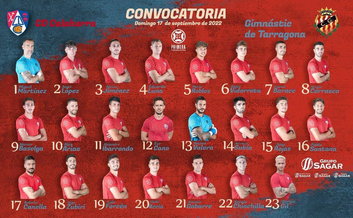 El Calahorra se enfrenta este sábado a las 20:00 en La Planilla al Nàstic de Tarragona en la cuarta jornada del Grupo 2 de 1ª Federación. Los rojillos han dado a conocer en la mañana sabatina la lista de convocados en la que están incluidos todos y cada uno de los futbolistas de la plantilla.