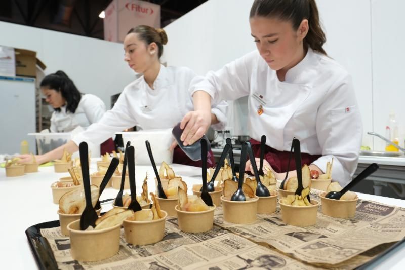 Jorge Alonso López es uno de esos alumnos. Tiene 20 años y está cursando el grado superior de Cocina y Servicios. Este es su segundo año en FiTUR, la cita de turismo internacional más importante que no quiere perderse. “Trabajamos mucho, sí, pero también hay tiempo para pasárselo bien y disfrutar”. Además, Alonso concibe esta feria como una oportunidad, un escaparate “porque aquí viene mucha gente y es importante para nosotros darnos a conocer”.