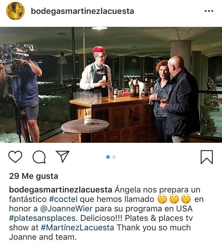 Entre los lugares elegidos por Joanne para visitar en nuestra comunidad se encuentran las Bodegas Martinez La Cuesta, convirtiéndolas así en uno de los escenarios para un nuevo episodio de su serie. Tal y como muestra el perfil de instagram de las bodegas, la barmaid del Vermutiki de Logroño, Ángela Albuixech, prepara un fantástico cóctel para el programa, Plates & Places.