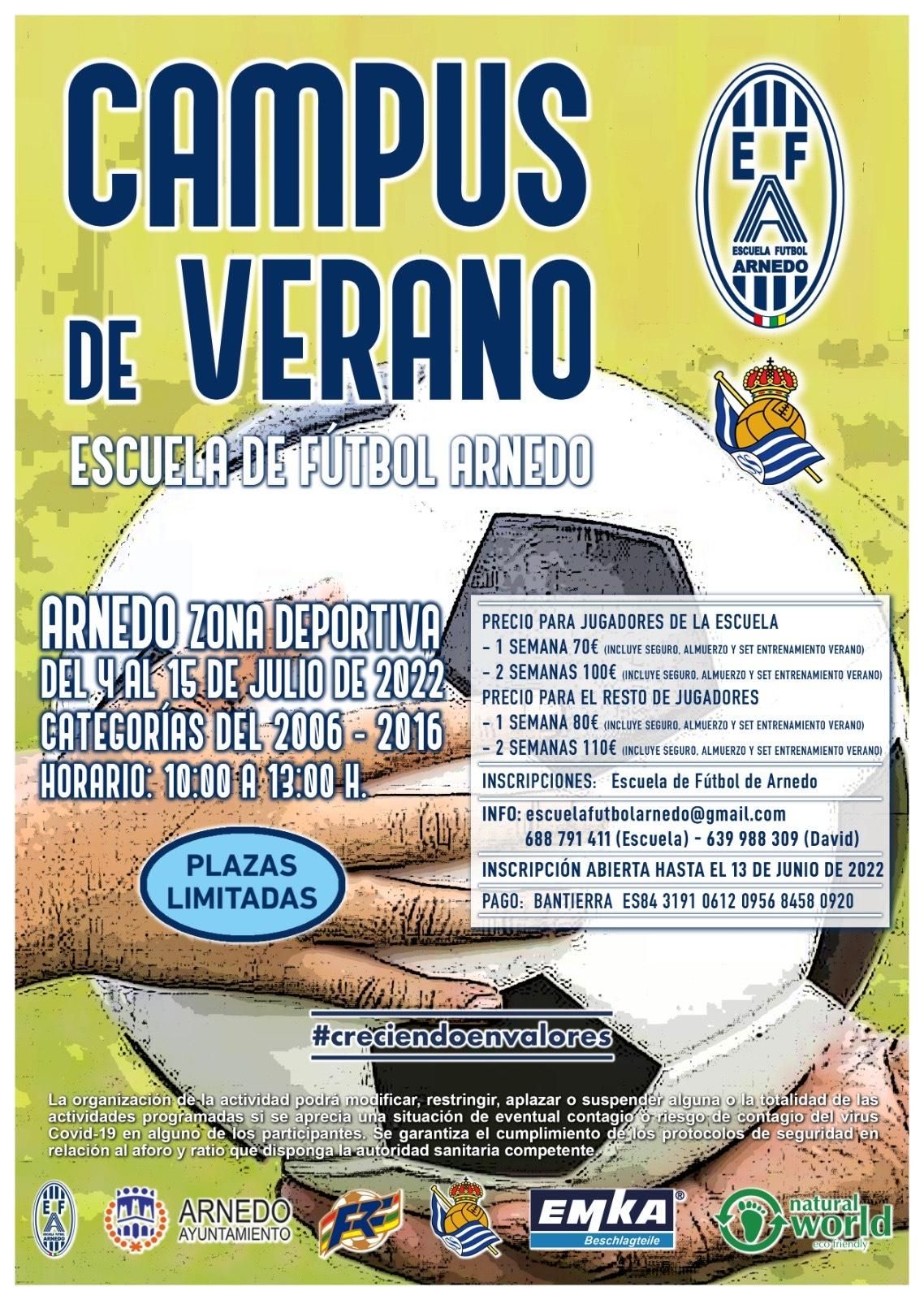Este año el Campus verá alterado su normal devenir por el cambio de alguna de las instalaciones habituales. El campo de F11 de hierba artificial estará presumiblemente siendo sustituido en esas fechas, y el Arnedo Arena no podrá ser utilizado por no estar instalada la pista polideportiva en el mismo. No obstante, la Escuela reinventará otros espacios para dar servicio a la actividad. Para poder inscribirse en este Campus será necesario enviar el formulario que se está compartiendo en los canales habituales de la Escuela y formalizar el pago en la cuenta que aparece en el cartel.