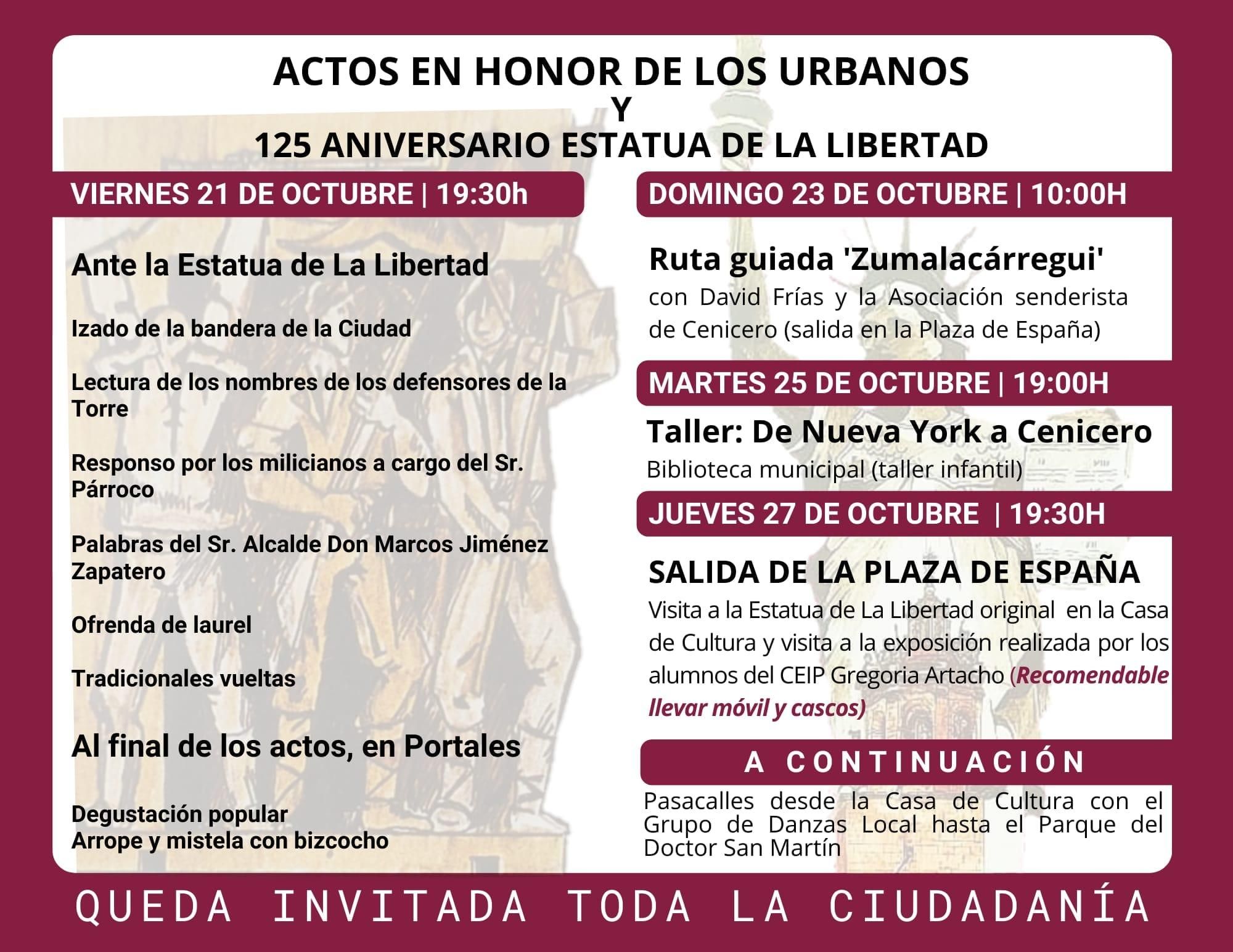 La celebración del 125 aniversario el 27 de octubre comenzará a las 19.30 con la visita a la Estatua de la Libertad orginal y de una exposición organizada por el CEIP Gregoria Artacho. En la Plaza del Doctor San Martín se dearrollará después el acto institucional, con el Grupo de Danzas Local y la actuación de Sapo Producciones y el dúo musical Elisa y Elena.