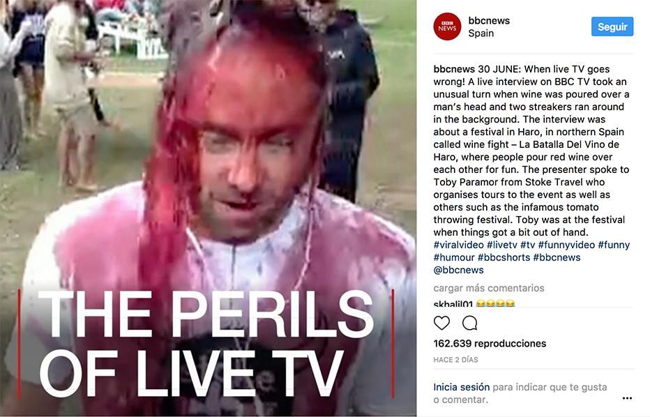 El vídeo en cuestión fue publicado con la siguiente explicación: “¡Los peligros de la televisión en directo! Una entrevista dio un giro imprevisto cuando alguien vertió vino sobre la cabeza del entrevistado y dos hombres desnudos pasaron por detrás. La entrevista versaba sobre un festival en el norte de España denominado la Batalla del Vino de Haro, donde la gente se echa vino por encima por diversión”.