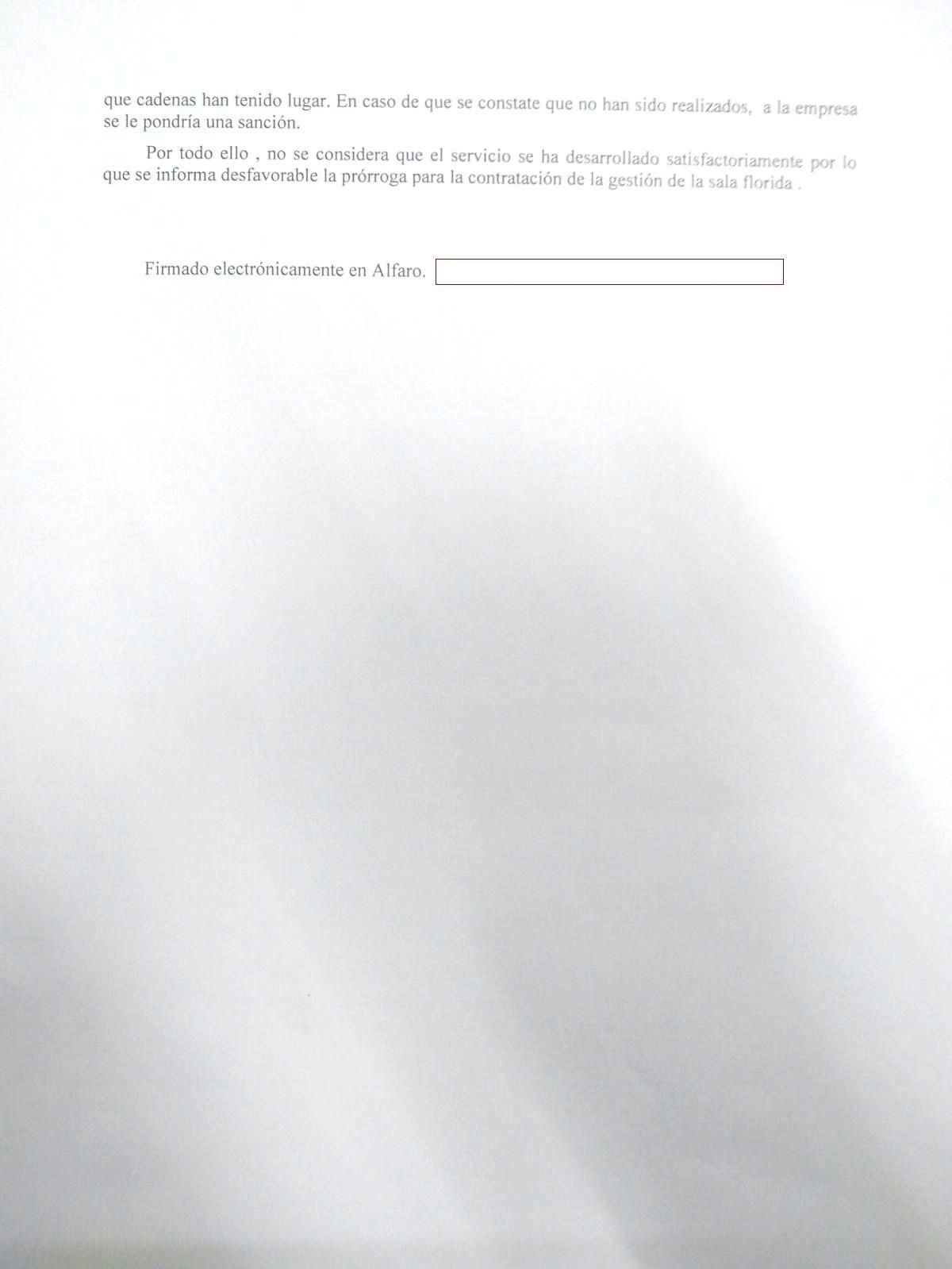 Por todo ello, concluye el informe de la técnico municipal, “no se considera que el servicio se ha desarrollado satisfactoriamente por lo que se informa desfavorablemente la prórroga para la contratación de la Sala Florida.”
