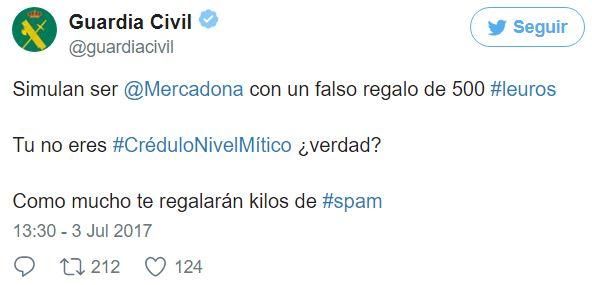 La Guardia Civil ha advertido a través de un tuit , con el tono tan irónico que caracteriza las redes de esta entidad. de una nueva estafa donde unos hackers suplantan la identidad de Mercadona e intentan sustraer los datos de los usuarios de este supermercado, cono indica el Huffington Post.