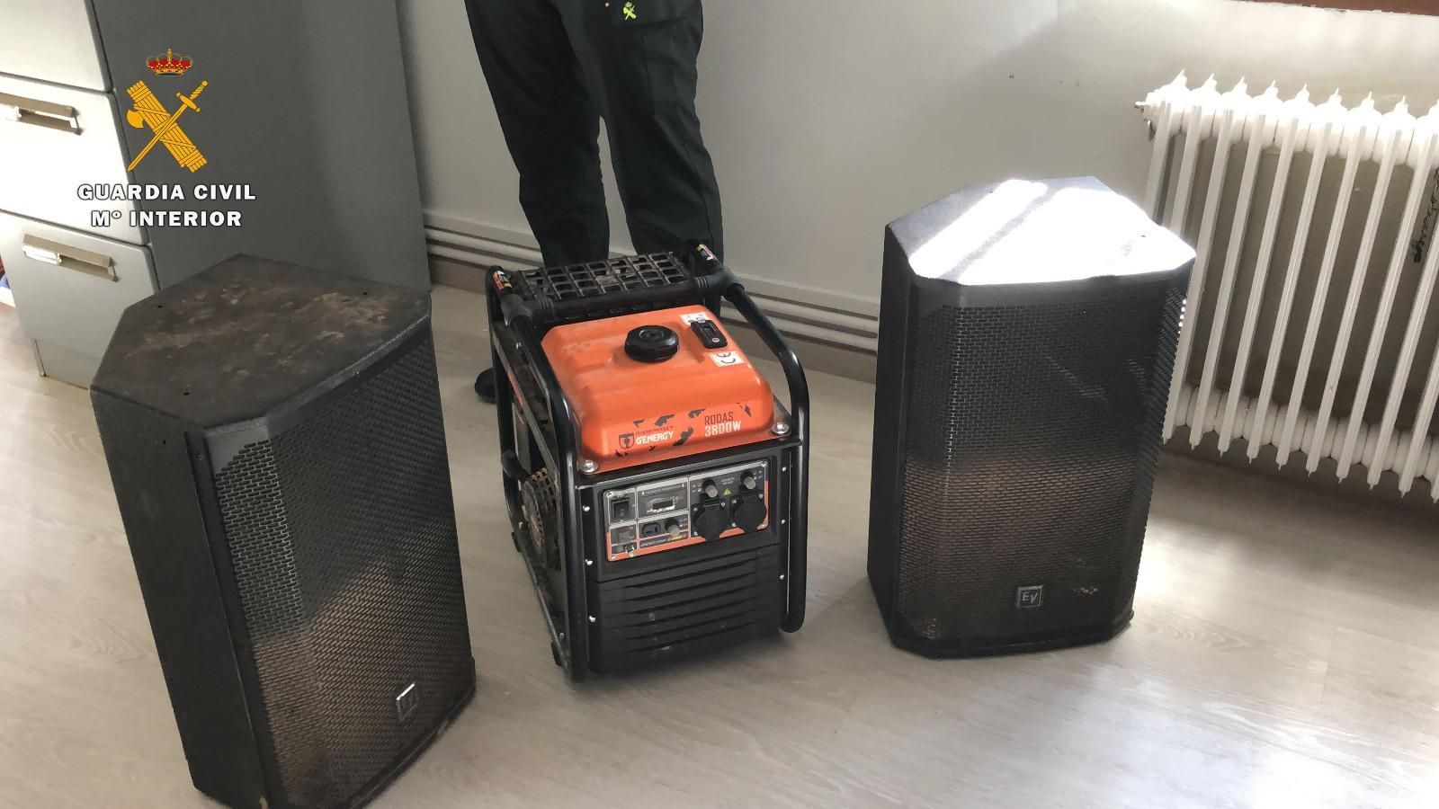 Durante esta actuación se procedió a la incautación de una parte del material que se estaba utilizando en la “rave” (dos altavoces de grandes dimensiones y un generador de 3800w.)