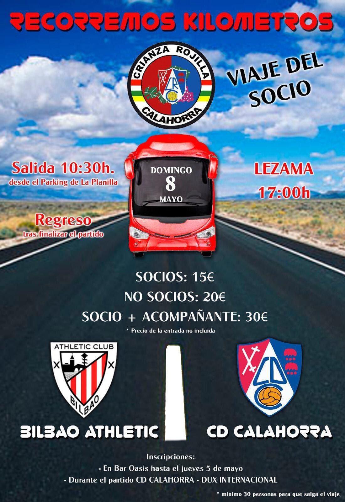 La peña Crianza Rojilla ha organizado un viaje para que la afición del Calahorra pueda desplazarse en autobús hasta Lezama de cara al partido del domingo a las 17:00 ante el Bilbao Athletic en el marco de la 35ª jornada del Grupo 1 de la Primera RFEF. Las inscripciones llevan días abiertas y se necesita un mínimo de 30 personas para que salga el viaje. La fecha límite para apuntarse es este jueves 5 de mayo en el Bar Oasis calagurritano. Los socios de la peña pueden obtener su plaza por 15 euros, los no socios por 20 y, existe una promoción, en la que un socio y un acompañante pueden unirse por el precio de 30 euros.