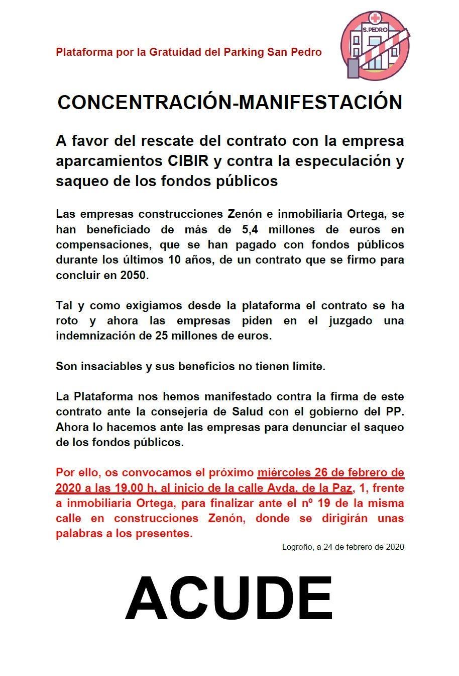 La Plataforma por la Gratuidad del Párking del Hospital San Pedro ha convocado para este miércoles una manifestación a favor del rescate del contrato con la empresa Aparcamientos CIBIR y “contra la especulación y saqueo de los fondos públicos”.