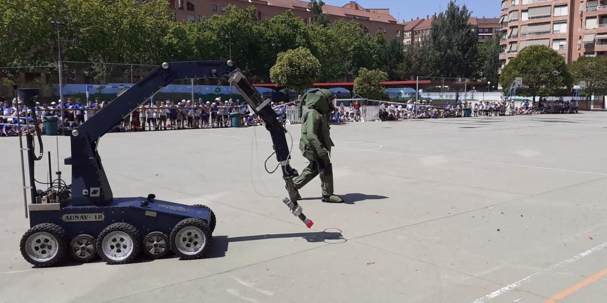 La exhibición ha continuado con un ejercicio de los Tedax-NRBQ quienes, con su equipación especial y junto a un robot especializado, han simulado la desactivación de una bomba en un paquete, que han hecho estallar.